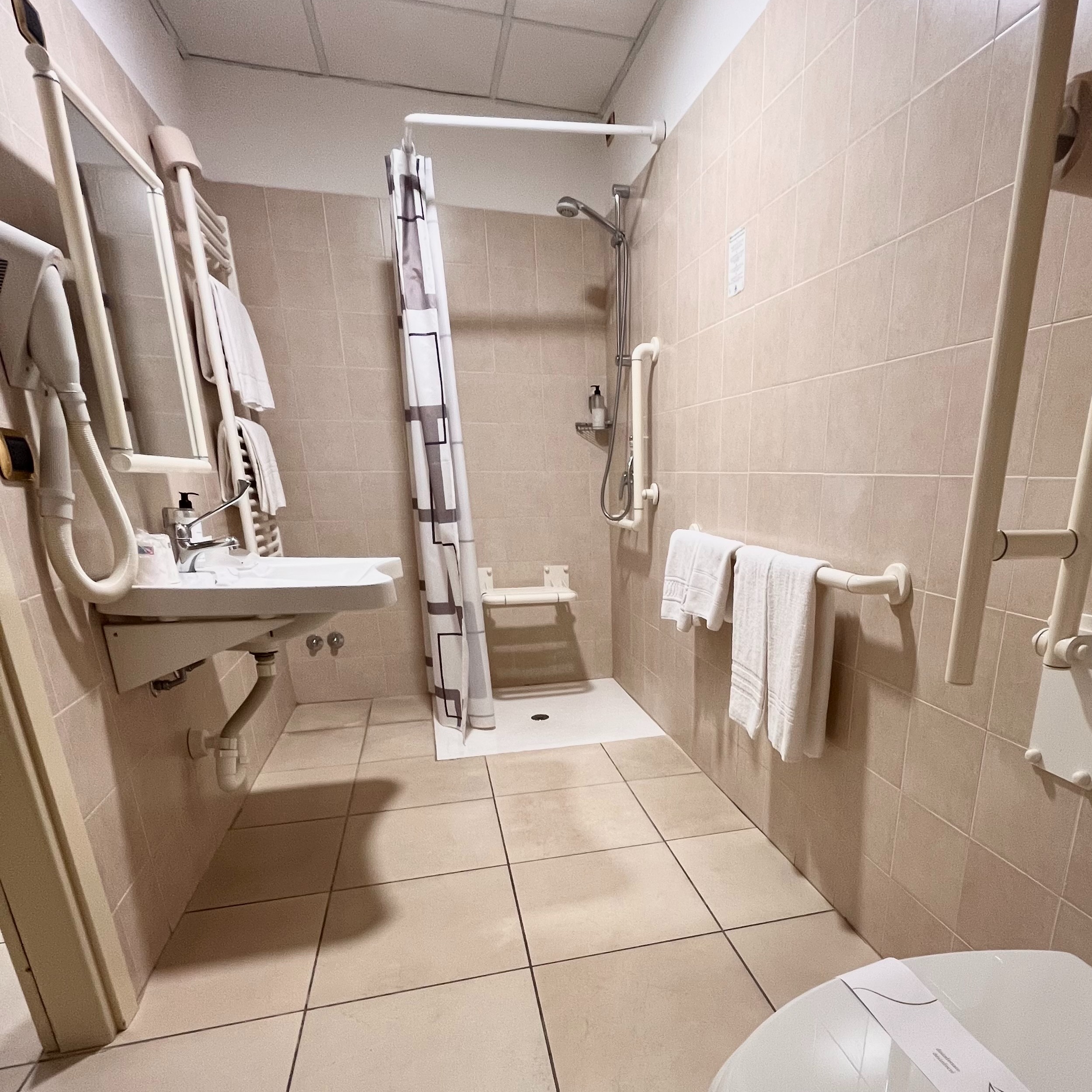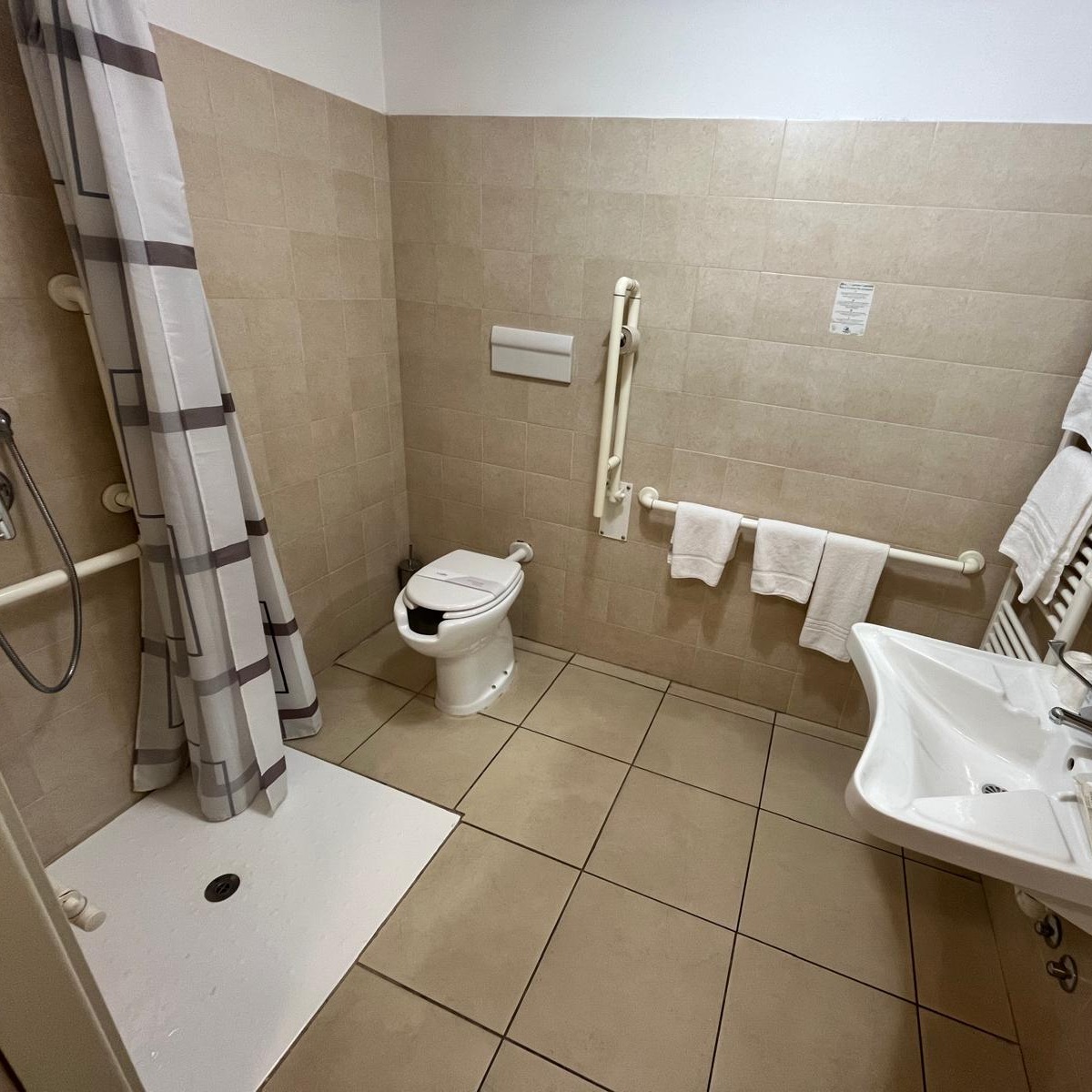 Le camere senza barriere architettoniche hanno spazi più ampi e un arredamento adatto a tutti gli ospiti, con un occhio di riguardo alle necessità di ospiti in carrozzina o con ridotte capacità motorie. Tutti gli spazi della camera sono accessibili comodamente e il bagno è attrezzato con WC rialzato, lavandino sospeso, doccia a livello pavimento con tenda, sedia reclinabile e maniglioni. Non è presente il bidet.